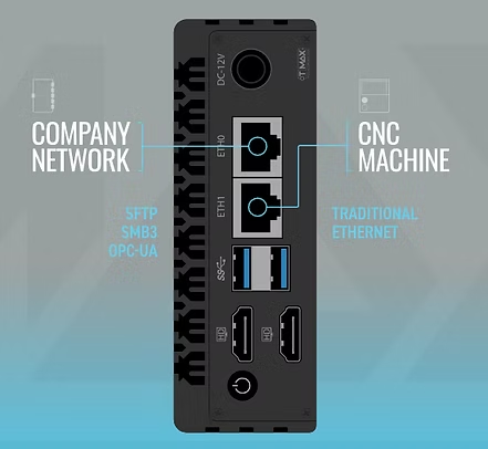 Der OT-Max ist mit zwei separaten Netzwerkschnittstellen ausgestattet: eine ist mit der Maschine verbunden, die andere mit dem Unternehmensnetzwerk. Dieses Design isoliert sensible CNC-Steuerungen von Netzwerkschwachstellen und gewährleistet gleichzeitig sichere und nahtlose Daten und Abläufe.